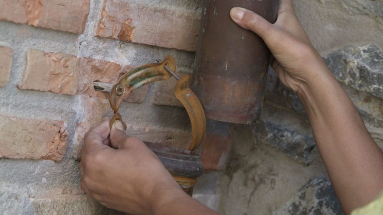 De esta manera debemos tomar en cuenta que las abrazaderas que fija esta bajante a la pared tiene holgura, lo que hace que quede el tubo con cierto movimiento. Para evitar que el viento pueda provocar algún percance vamos a fijarla con un plaste de gran adherencia.