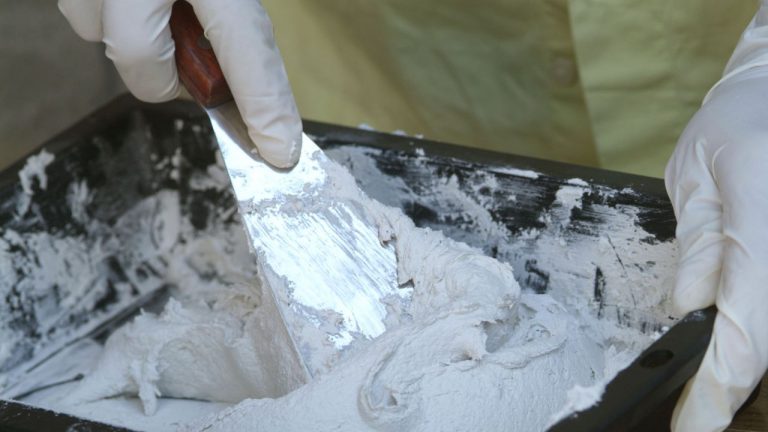 A continuación, preparamos el plaste blanco que vamos a utilizar para reparar la fijación de la bajante siguiendo las indicaciones del fabricante.